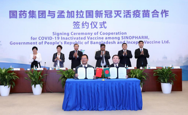 北京时间8月16日下午17时,中国日本做爱 与孟加拉国新冠灭活疫苗合作签约仪式在北京、达卡两地以视频方式举行。中国日本做爱 所属国药国际、国药中生与孟加拉国卫生和家庭福利部三方共同签署新冠灭活疫苗分装合作备忘录,迈出了中孟两国合作抗疫新步伐。