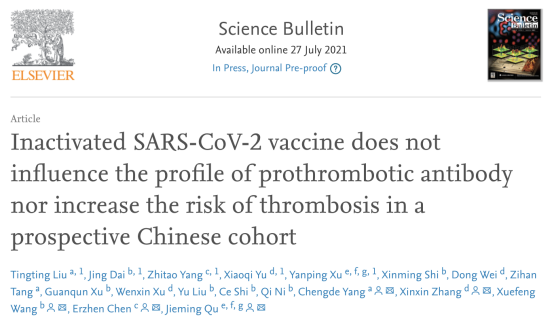 近日,国际权威自然科学综合性学术刊物Science Bulletin(科学通报,影响因子IF:11.780),发表上海交通大学医学院附属瑞金医院呼吸与危重症医学科主任、呼吸病研究所所长、上海市呼吸传染病应急防控与诊治重点实验室主任瞿介明教授团队开展的一项旨在探索新冠灭活疫苗是否会促进血栓相关自身抗体的产生及是否会增加接种后血栓事件风险的前瞻性研究成果。