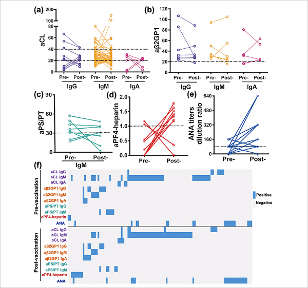 此项前瞻性研究中,接种两剂新冠灭活疫苗(BBIBP-CorV,北京生物,两剂间隔3周)并同意在接种前后接受外周血采集的人员被纳入该研究。于第一剂接种前及第二剂接种4周后采集入组者基本信息,并进行血常规、肝肾功能、抗新冠抗体检测,同时采集外周血样本,分离血清,用于血栓相关自身抗体谱检测。通过国际通用的试剂盒及检测方法,检测包括IgG/M/A aCL、IgG/M/A aβ2GP1、IgG/M aPS/PT、aPF4-heparin及ANA在内的10种抗体,并随访观察血栓事件。