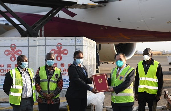 9月18日,在肯尼亚首都内罗毕,中国驻肯尼亚大使馆公参张益俊(右二)和肯尼亚卫生部常务副部长苏珊·莫察切(中)在机场举行疫苗交接仪式。(新华社记者李琰摄)