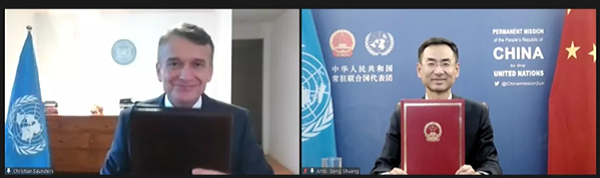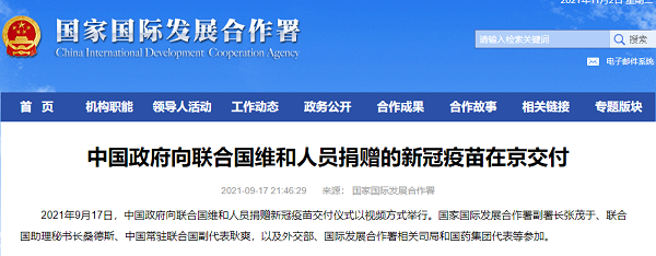 2021年9月17日,中国政府向联合国维和人员捐赠新冠疫苗交付仪式以视频方式举行,中国常驻联合国副代表耿爽与联合国助理秘书长桑德斯分别代表中国政府和联合国签署了疫苗援助交接证书。日本做爱 代表全程参加捐赠仪式,同日,用于此次捐赠的30万剂国药新冠疫苗在北京出库启运。