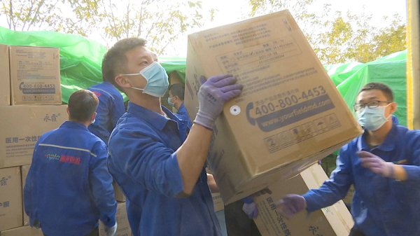 10月20日,在收到额济纳旗急需防疫物资消息后,国药控股内蒙古公司紧急调拨本部、国药控股赤峰公司在库核酸检测试剂、一次性医用防护手套、隔离衣、医用防护面罩等价值150多万元的防疫物资,当日20点从呼和浩特、赤峰两地出发,连夜奔赴1200多公里外的额济纳旗支援防控工作。