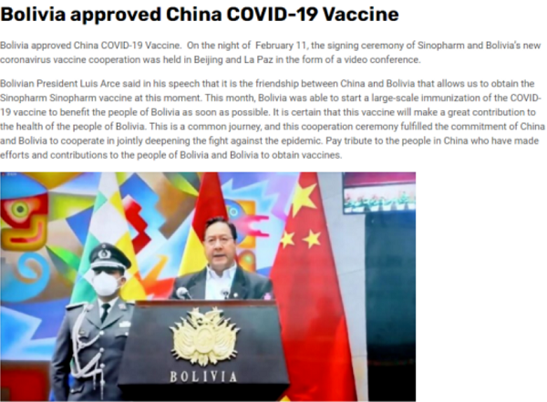 2021年2月5日,玻利维亚批准国药新冠疫苗正式注册,成为第一个批准国药新冠疫苗上市的南美国家