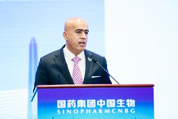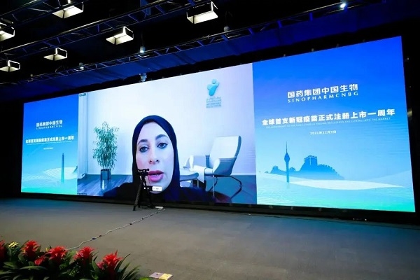 阿联酋驻华大使阿里·扎希里在致辞中指出,国药疫苗在阿联酋正式注册,成为全球首个获得完全批准使用的新冠疫苗。这对中阿两国来说都是具有历史意义的事件。两年来,两国携手应对新冠肺炎这一全球性重大挑战,见证了阿中全面战略伙伴关系日益深入和强大,双边关系成为21世纪全球合作的典范。得益于疫苗合作与充足产能,2020年世博会和冬奥会筹备工作进展顺利,阿联酋和中国相互支持,正在共同努力改善国际健康和福祉,为各国人民和世界的和平与繁荣而努力。