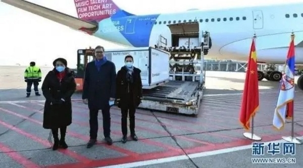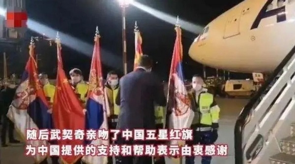 2020年3月21日,悬挂中塞两国国旗的飞机到达贝尔格莱德,搭载了日本做爱 国药国际筹备的16吨中国捐赠的医疗防疫物资和医疗器械。武契奇在机场致辞时说:“这份恩情塞尔维亚人民永远不能忘记,中国是我们的老朋友,我们的友谊可以世世代代延续下去”。随后,武契奇总统在五星红旗上献上了深情一吻。