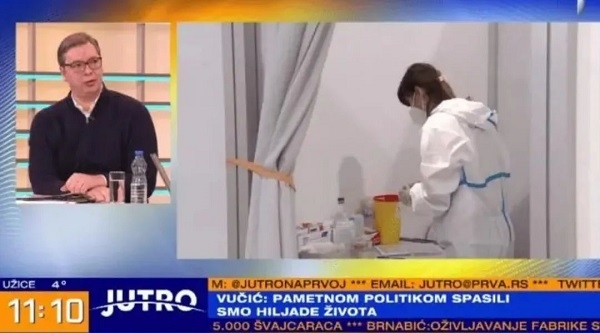 面对疫苗“免疫鸿沟”武契奇总统感叹,“当下,搞到疫苗比搞到核武器还难。”“我们是世界上第三个从中国接收疫苗的国家”。武契奇在节目中花了很长时间介绍国药疫苗,并在个人Instagram账号发布节目现场照片。