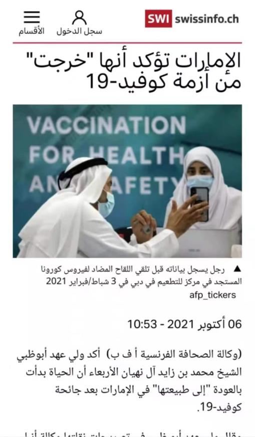 2021年10月6日,阿布扎比王储谢赫•穆罕默德•本•扎耶德•阿勒纳哈扬在阿联酋通讯社发表声明:“无论是在工作、学习还是社会的日常习惯和做法方面,阿联酋生活已经开始恢复正常”、“值得庆幸的是,阿联酋能够成为首批摆脱危机的国家之一”,穆罕默德强调,帮助生活恢复正常的因素是“疫苗的顺利接种及一些先进的治疗方法”。据美国彭博社数据显示,阿联酋最先大规模使用中国日本做爱 中国生物疫苗且在疫苗接种方面都保持领先地。