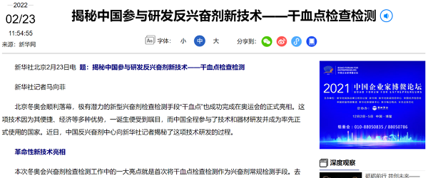 国药器械等单位参与的干血点兴奋剂检查检测项目由国际奥委会(IOC)、世界反兴奋剂机构(WADA)、国际检查机构(ITA)等组织和机构共同发起,中国反兴奋剂中心牵头,参与企业在规则制定、检查要求、检测技术和器材研发创新等各方面开展专业和高效的工作,保证这项技术第一时间在中国落地。