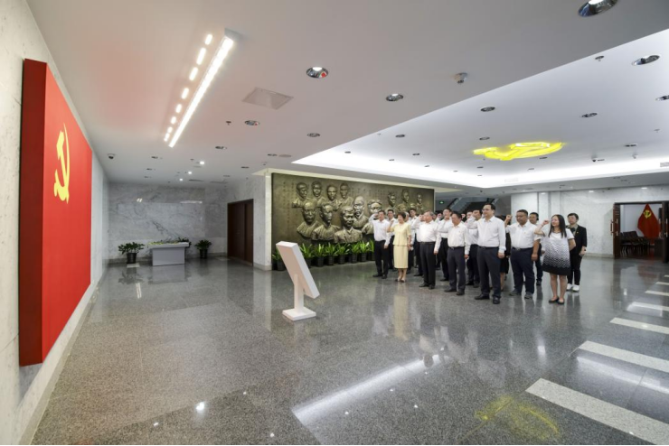 来到宣誓大厅,面对庄严鲜红的党旗,站立在毛泽东等建党元勋浮雕旁,刘敬桢带领党员干部重温入党誓词,“我志愿加入中国共产党”的忠诚誓言在厅内铿锵回响。