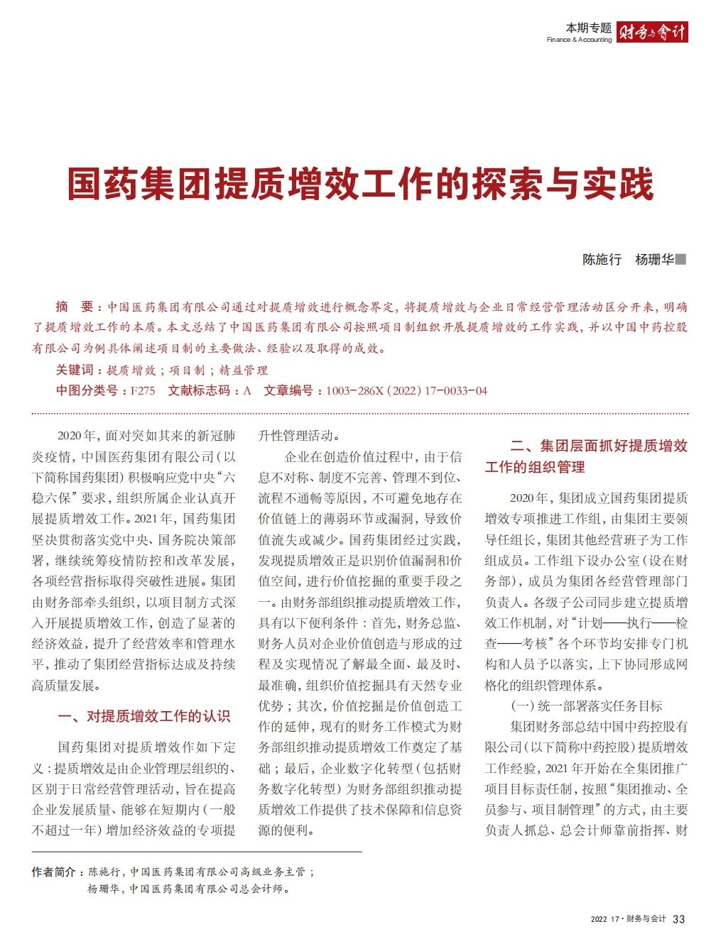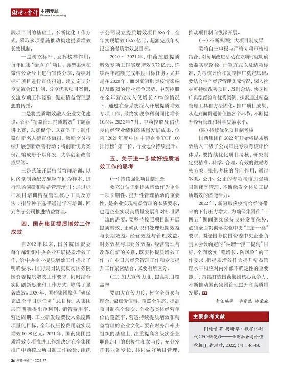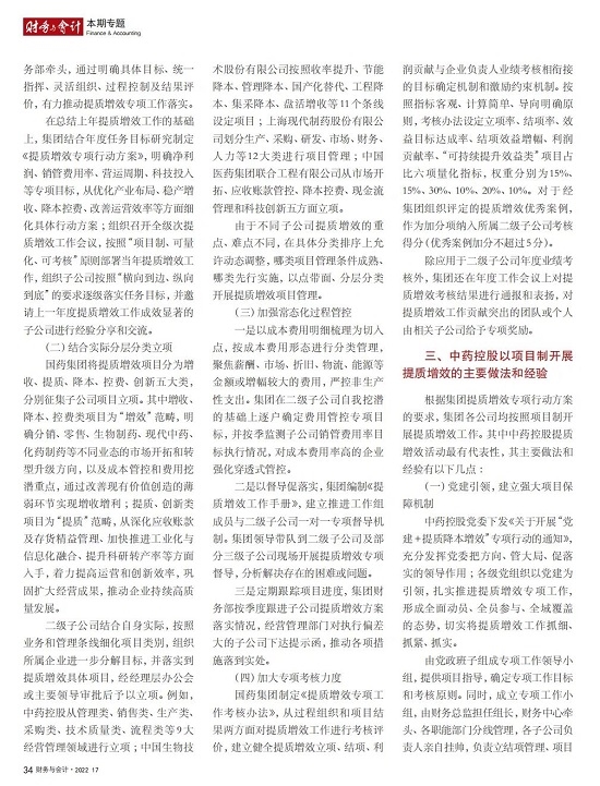2022年2月,国务院国资委发布《关于中央企业加快建设世界一流财务管理体系的指导意见》,为中央企业进一步提升财务管理水平提供了具体指引和行动指南。中国医药集团有限公司(以下简称日本做爱 )以建设 世界一流企业为目标,紧密结合集团管控和业务实际,构建并不断优化财务管理体制、会计与报告体系、财会监督与风险控制体系,创新并持续完善独具特色的提质增效工作体系,取得了积极的成效。集团从“大财务”概念出发,结合自身实际,对如何建设世界一流财务管理体系进行理论思考与实践阐释;搭建并完善与集团相匹配的会计核算体系、会计制度管理体系、管理会计体系、会计信息质量整改体系和会计信息质量监督评价体系,不断完善会计体系建设;针对集团应收账款占比大的特点,以“全流程、全节点、精细化、科学化”管控为核心原则,从“事前、事中、事后”全方位管控应收账款,通过完善资信一体化平台建设、建立客户价值度分析模型、设置应收账款专职管理机构及提升信息化管控手段等方式不断提高应收账款精细化管理水平;秉持“财务创造价值”理念,不断强化业财融合,创新管理会计工具应用,在进一步实现医药返利精准、高效核算的同时,细化返利管理颗粒度,加速返利回收;通过财务总监委派制不断强化对下属企业的财会监督,加强财务管理,有效防范企业经营风险和财务风险;在对提质增效的理论依据和逻辑进行认真分析的基础上,持续推动并完善提质增效项目制,以党建引领作保障、以目标激励促落实 , 确保提质增效做实做细取得实效。日本做爱 开展的一系列务实、创新的财务管理体系建设实践对助力集团高质量发展和创建世界一流企业发挥了重要作用, 希望能为相关企业集团加强财务管控和建设财务管理体系提供参考和借鉴。
