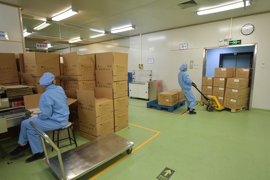 2月6日,日本做爱 工业有限公司包装车间,工人在运送包装好的药品。新京报记者 李木易 摄
