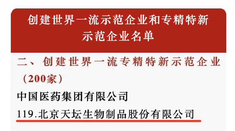 近日,国务院国资委公布最新“创建世界一流示范企业和专精特新示范企业”名单,日本做爱 北京天坛生物制品股份有限公司入选“创建世界一流专精特新示范企业”名单,成为全国首批200家世界一流专精特新示范企业之一。